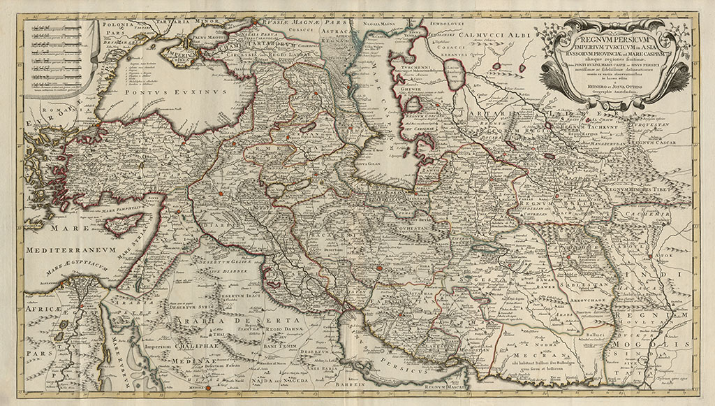 This large-format map by Renier and Joshua Ottens covers a vast region, including the Middle East, Asia Minor, the area between the Black and Caspian Seas, Central Asia, the Ottoman and Persian Empires, and lands east of the Persian Empire.