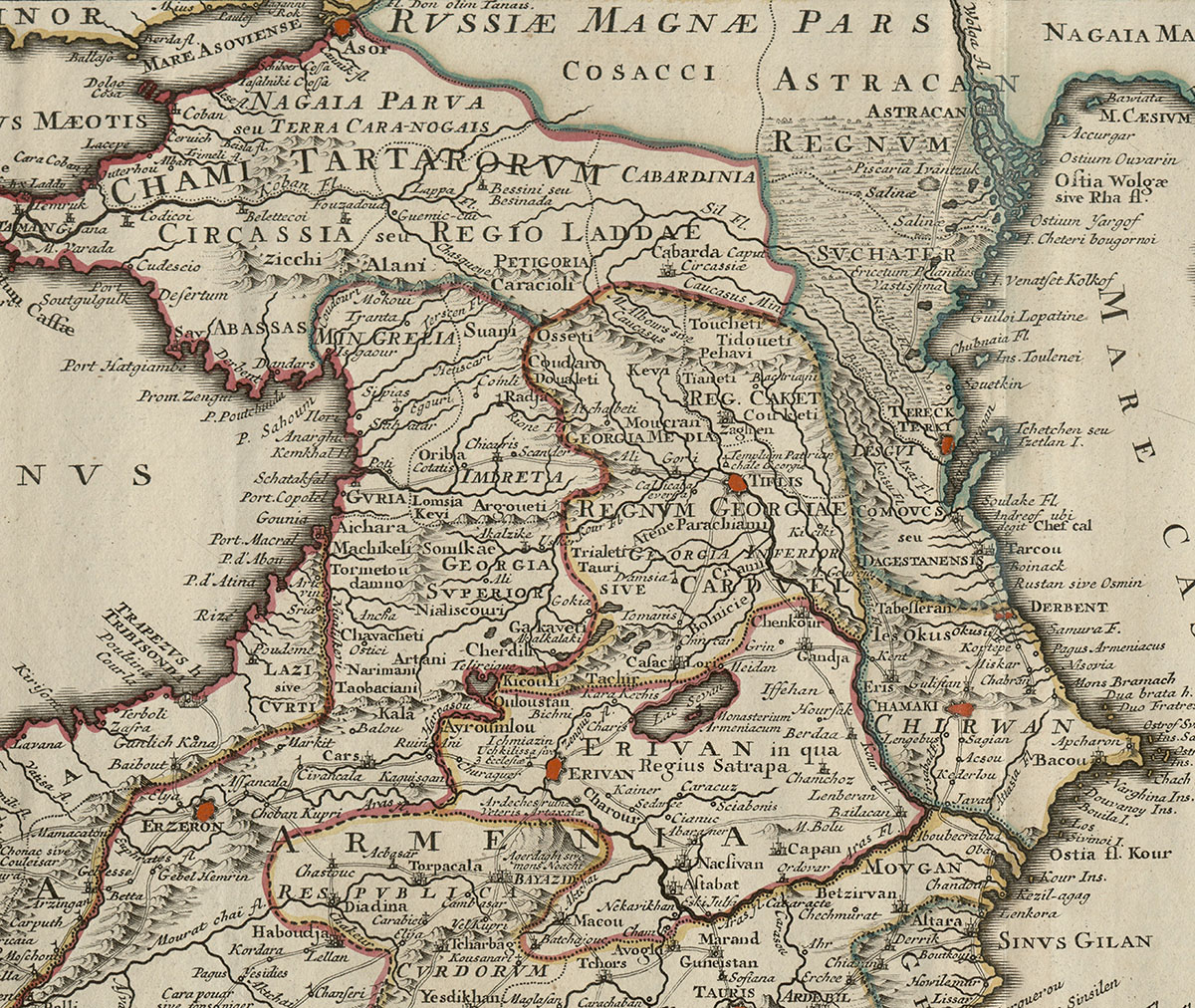 On the map of Oteens, the information about Georgia and the surrounding countries is taken from the map of the neighboring countries of the Caspian Sea by the royal cartographer of Louis XIV, Guillaume Grelot, printed in Paris in 1723. This map was created based on the chronicles of the Georgian diplomat, traveler and writer, Sulkhan-Saba Orbeliani.