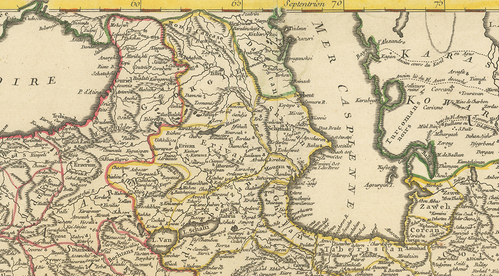 რუკაზე ასევე დატანილია აღნიშვნები: ARMENIE (არმენია), Shirvan (შირვანი), Adirbeitzan (ადერბაიჯანი), Baku (ბაქო), Schamaki (შემახი), Erivan (ერევანი) და სხვა არაერთი.