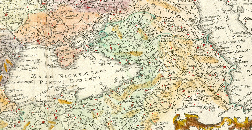 რუკაზე შავ და კასპიის ზღვებს შორის არსებული არაერთი მნიშვნელოვანი ქალაქი და სხვა გეოგრაფიული პუნქტია დატანილი. საქართველო აღნიშნულია ევროპის ქვეყნებში გავრცელებული მისი ყველაზე პოპულარული სახელწოდებით - Georgia. თუმცა, რუკაზე ეს სახელწოდება ორი ფორმითაა გამოყენებული: აღნიშვნა “Georg Turc” მიუთითებს დასავლეთ და სამხრეთ დასავლეთ საქართველოში ოსმალეთის იმპერიის გავლენის ზონაზე, ხოლო “Georgia Persica” - აღმოსავლეთ საქართველოში სპარსეთის იმპერიის გავლენის ზონაზე.
