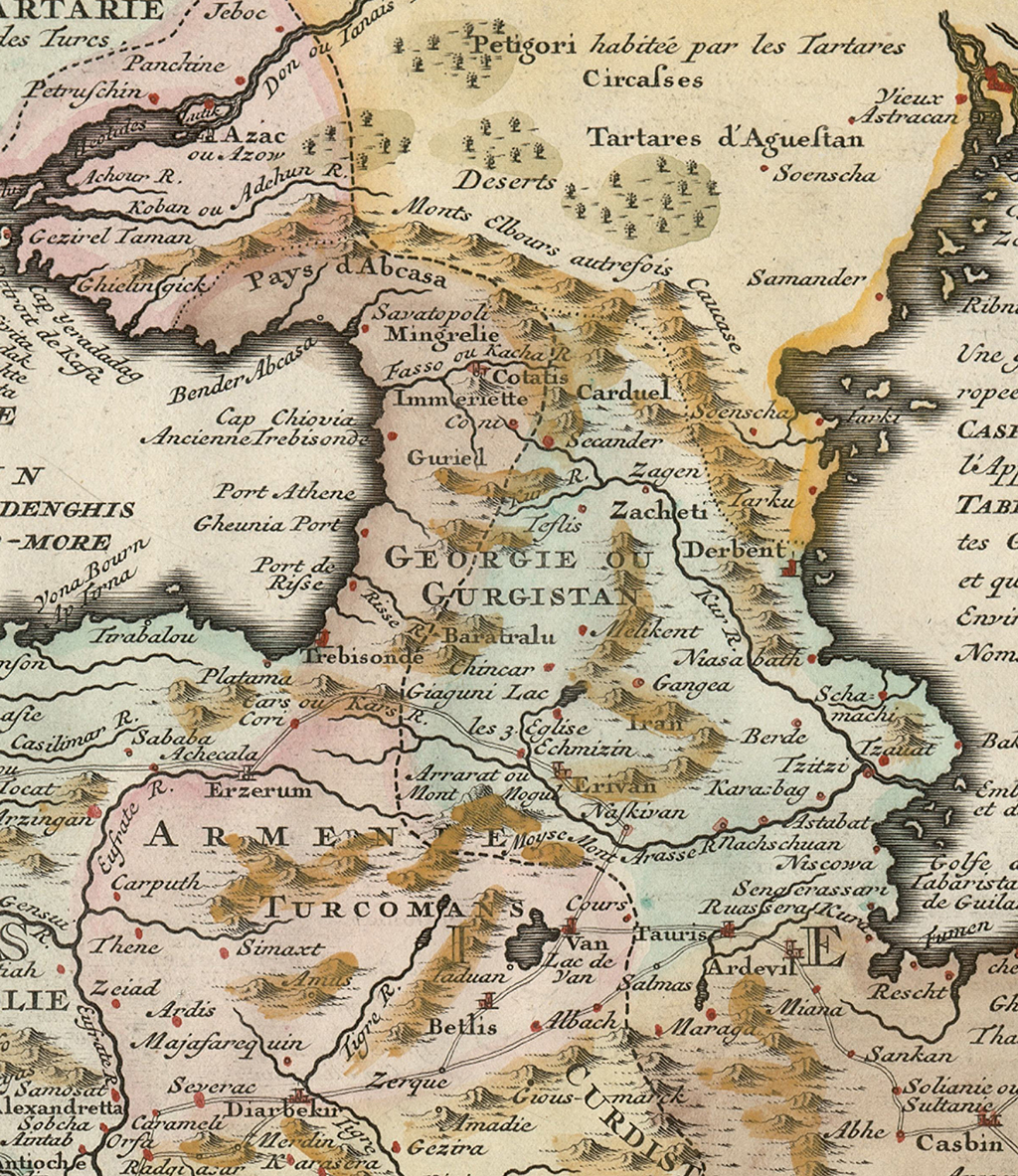 რუკაზე მნიშვნელოვანი ცნობებია წარმოდგენილი შავ და კასპიის ზღვებს შორის არსებული ქვეყნების შესახებ. საქართველოს აღსანიშნავად გამოყენებულია ტოპონიმები: GEORGIE და GURGISTAN. იოლად იკითხება: Guriel (გურია), Mingrelie (სამეგრელო), Immeriette (იმერეთი), Baratralu (სამცხე), Carduel (ქართლი), Zacheti (კახეთი), Chenia port (გონიო), Savatopoli (სოხუმი), Cotatis (ქუთაისი), Coni (ხონი), Secander (სკანდის ციხე), Teflis (თბილისი), Zagen (ძეგამი) და სხვა.