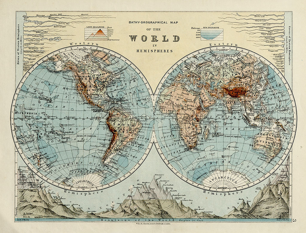 ალექსანდრ კეიტ ჯონსტონის რუკა. დაიბეჭდა „თანამედროვე გეოგრაფიის პოლიტიკური და ფიზიკური ატლასის” 1910 წლის გამოცემაში. რუკაზე მსოფლიო წარმოდგენილია ნახევარსფეროების სახით, ხოლო რუკის გარშემო დატანილია ცნობები მსოფლიოს დიდი მდინარებისა და უმაღლესი მწვერვალების შესახებ.