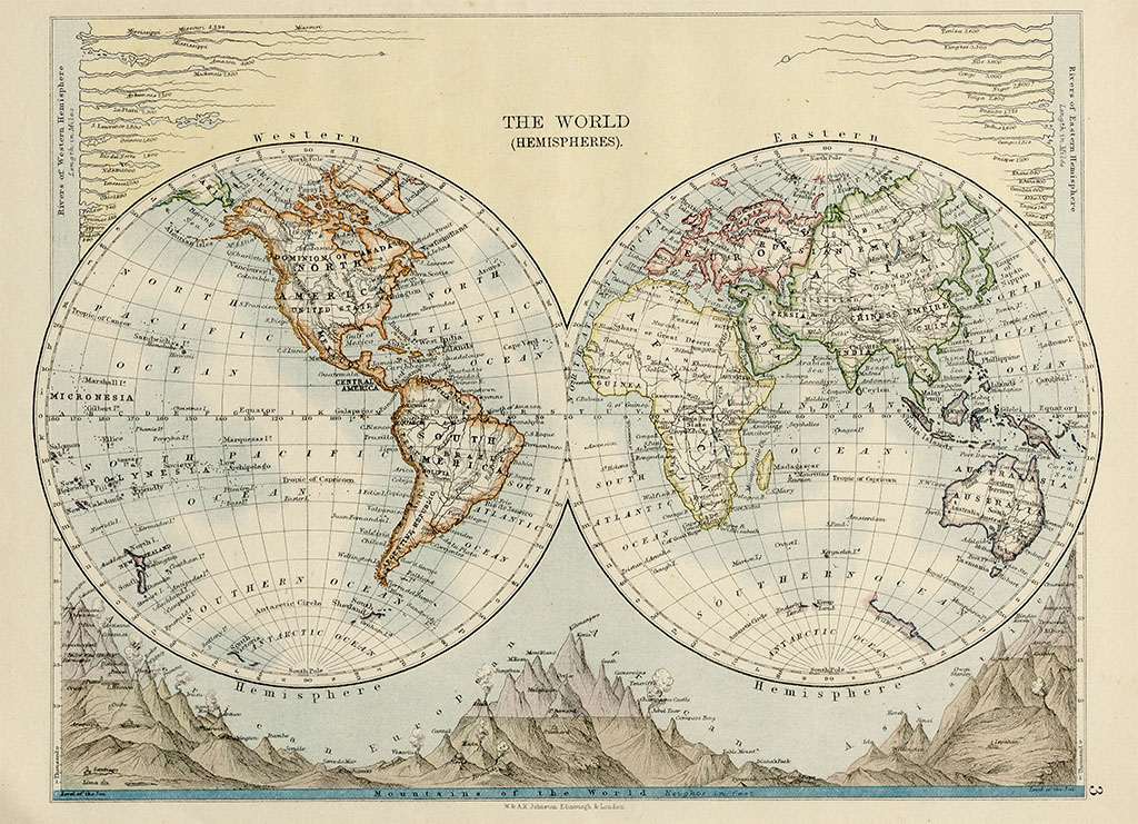 ალექსანდრ კეიტ ჯონსტონის რუკა, სახელწოდებით - The World (Hemispheres), დაიბეჭდა „თანამედროვე გეოგრაფიის პოლიტიკური და ფიზიკური ატლასის” 1895 წლის გამოცემაში. რუკაზე მსოფლიო წარმოდგენილია ნახევარსფეროების სახით, ხოლო რუკის გარშემო დატანილია ცნობები მსოფლიოს დიდი მდინარეებისა და უმაღლესი მწვერვალების შესახებ.