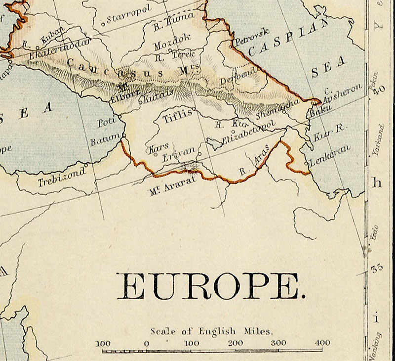 რუკის უკანა მხარეს წარმოდგენილია ევროპის რუკა, რომელზეც შავ და კასპიის ზღვებს შორის კარგად იკითხება შემდეგი ქალაქები და გეოგრაფიული პუნქტები: ბათუმი, ფოთი, ქუთაისი, თბილისი, ერევანი, ელიზავეტპოლი (დღევანდელი განჯა), შემახი, ბაქო, აფშერონი, ლენქორანი და სხვა. აღნიშნულია მდინარეები: მტკვარი და არაქსი, მთები: არარატი და იალბუზი.