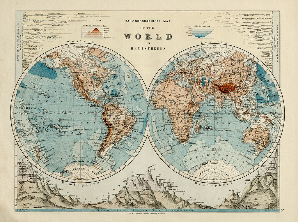 ალექსანდრ კეიტ ჯონსტონის რუკა. დაიბეჭდა, „თანამედროვე გეოგრაფიის პოლიტიკური და ფიზიკური ატლასის” 1906 წლის გამოცემაში. რუკაზე მსოფლიო წარმოდგენილია ნახევარსფეროების სახით, ხოლო რუკის გარშემო დატანილია ცნობები მსოფლიოს დიდი მდინარებისა და უმაღლესი მწვერვალების შესახებ.